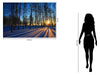 Experience the serene beauty of a winter sunset captured in this striking wall art titled "Sunset Forrest." Printed and hand-embellished beneath durable tempered glass, this piece offers a sleek, dimensional finish that enhances the vivid contrast between the glowing sun and the cool blue shadows cast by bare trees. Designed for contemporary spaces, it brings a peaceful yet dramatic natural landscape into your living room, bedroom, or office. Ready to hang with angled sawtooth hangers, this artwork combines safety, strength, and elegance while supporting a social cause with every purchase.