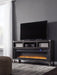Make watching TV a joy with this large TV stand. Its top surface accommodates TVs up to 70 inches. The stand's rustic-industrial style—with a gray finish, squared edges, zinc-tone corner bracket accents and nailhead detailing—is sure to complement any contemporary decor. Several vented open cubbies offer impressive shelf space, convenient for keeping all of your electronic gear within reach. Handy cutouts keep cords out of sight. For your added viewing pleasure, the wide fireplace insert gives you the cozy feel of a fireplace without the added hassle. With the touch of a button, adjust the temperature and the color-changing flames, and set the timer for long-lasting enjoyment. It comes with faux glass crystals and natural stones, so you can customize the look of the flame bed.