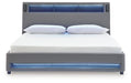 Snooze in style with this California king upholstered bed. It brings delightful function to winding down before bedtime, with an adjustable LED reading light on each side. And for added flair, multicolored ambient lighting brings an ultra-cool vibe to the overall look. Combining modern convenience with captivating design, this bed revamps your restful retreat like never before.