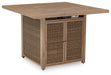 Details Includes gas fire pit table with CSA-approved 55,000 BTU stainless steel burner, glass beads, burner cover and all-weather protective cover, All-weather resin wicker woven over aluminum frame, Driftwood finish, Stainless steel hardware, Battery-operated ignition system with adjustable flame control; battery included, Cabinet door conceals gas propane tank (not included), Seats up to 8 (bar stools sold separately), Assembly required, Connection to propane tank or connector hose not provided