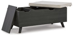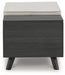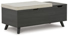 | Details | Made with engineered wood and decorative laminate, Replicated blackened wood finish with grayed textural grain, 2 hidden storage compartments, Linen-look polyester foam cushion, Removable seat cushion and tops, Tapered legs, Assembly required | |